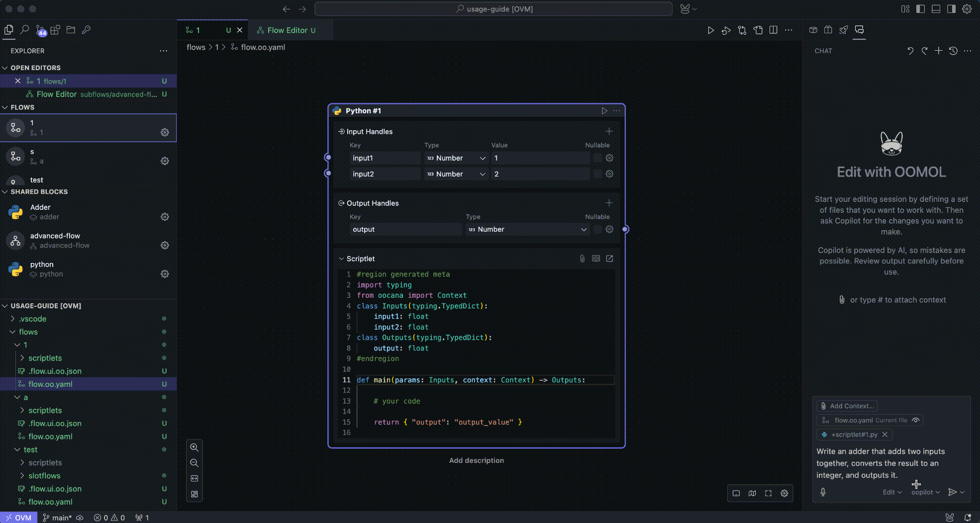 When editing code, you can try having AI help you implement functionality. In the menu bar of the scriptlet code box, click the Add Chat to Context button to open the AI chat box on the right side.