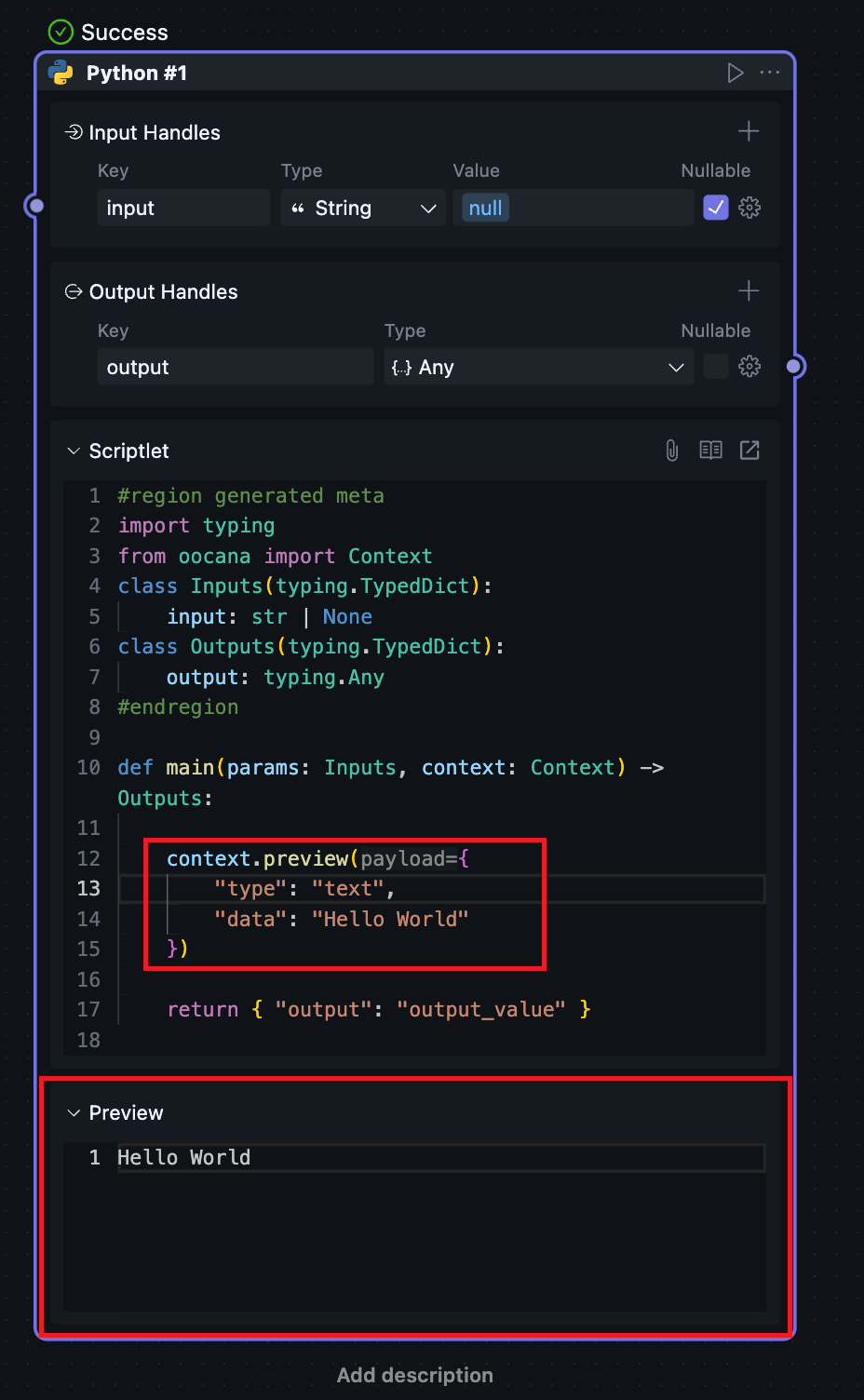 Using the context.preview() method in your code allows you to render various types of data below the Block after the Block runs.