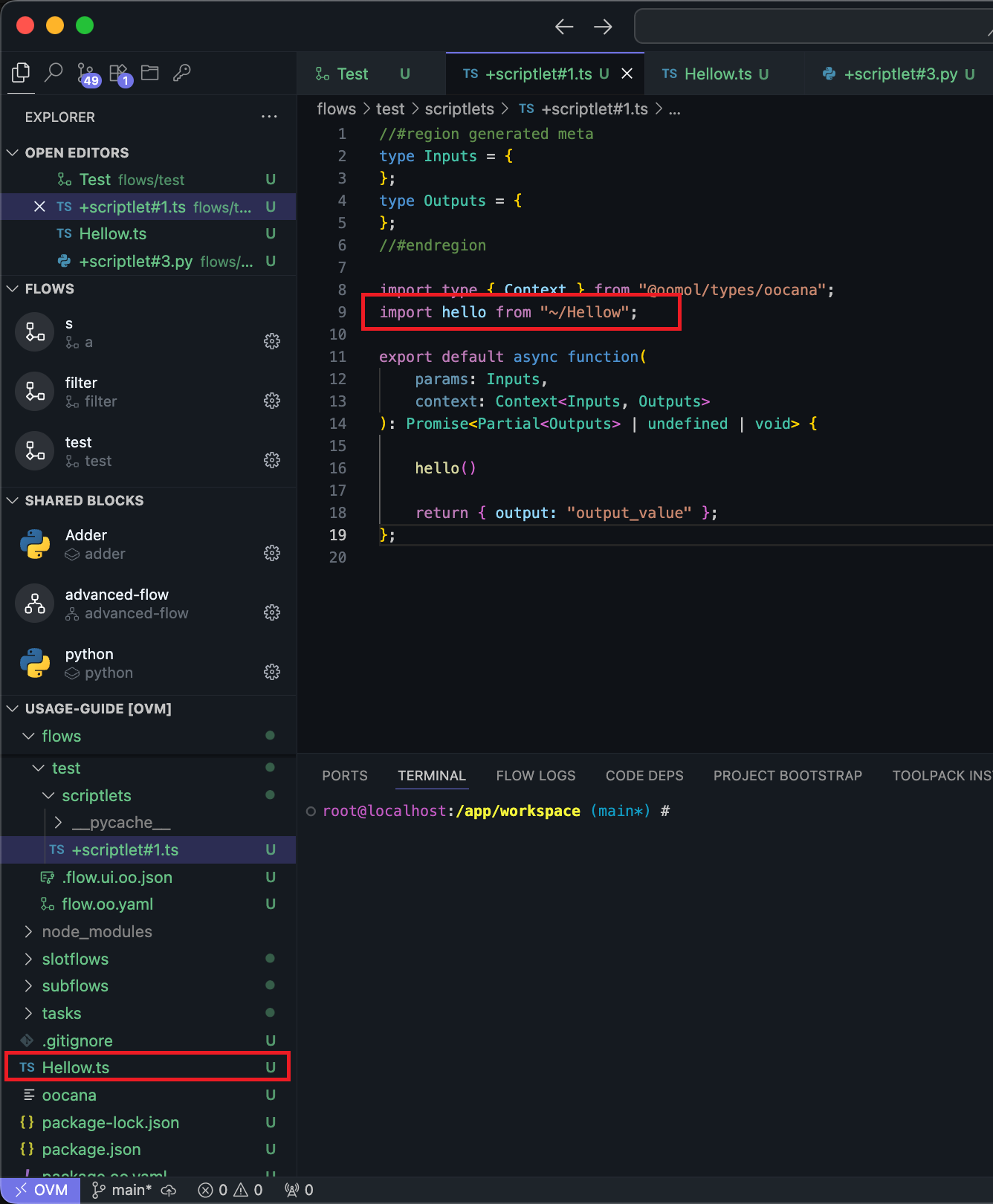 We can find the Hello.ts module in the project root directory through ~/Hello.