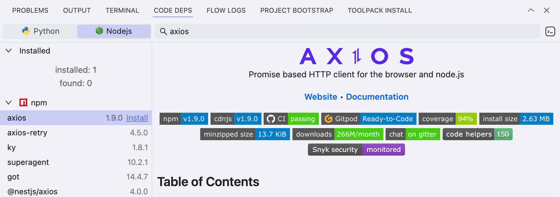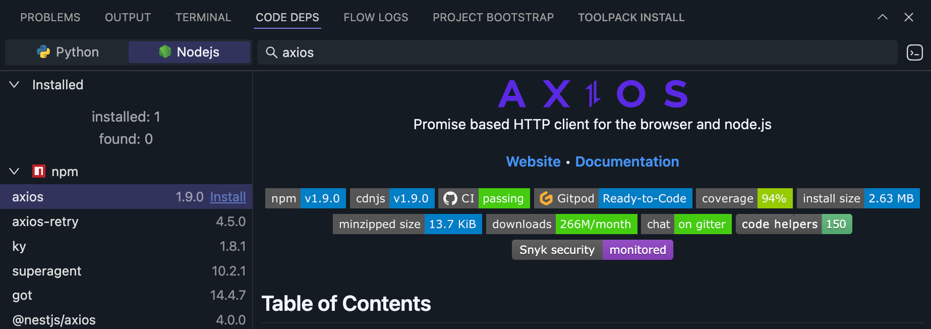 Here, you can install some npm / PyPI dependencies into the current project so you can include and call them in scriptlets.