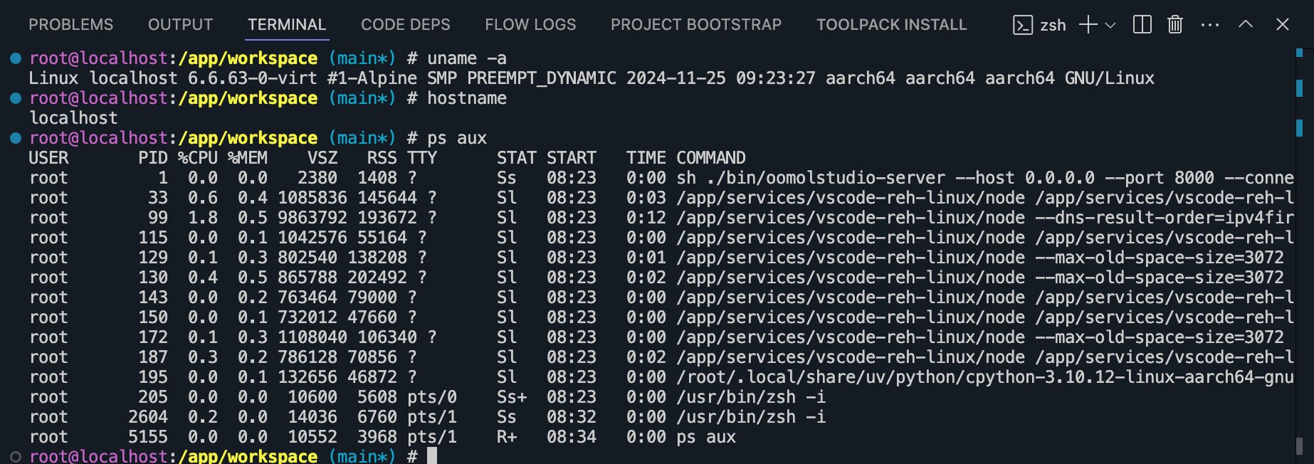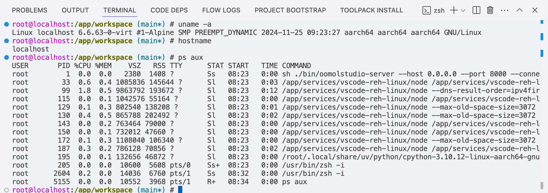 This area allows you to use a terminal within OOMOL Studio, where you can execute some Linux commands. The project runs in a container, not in your local environment, so commands executed here will generally not affect your local environment.