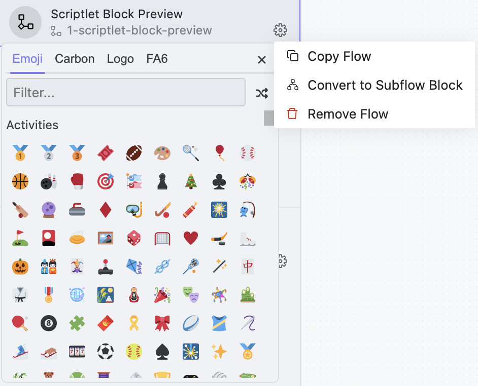 Clicking the left icon allows you to change the icon of this workflow, and clicking the gear icon in the lower right corner allows you to copy and delete it. The function of "Convert to Subflow Block" will be introduced in later sections.