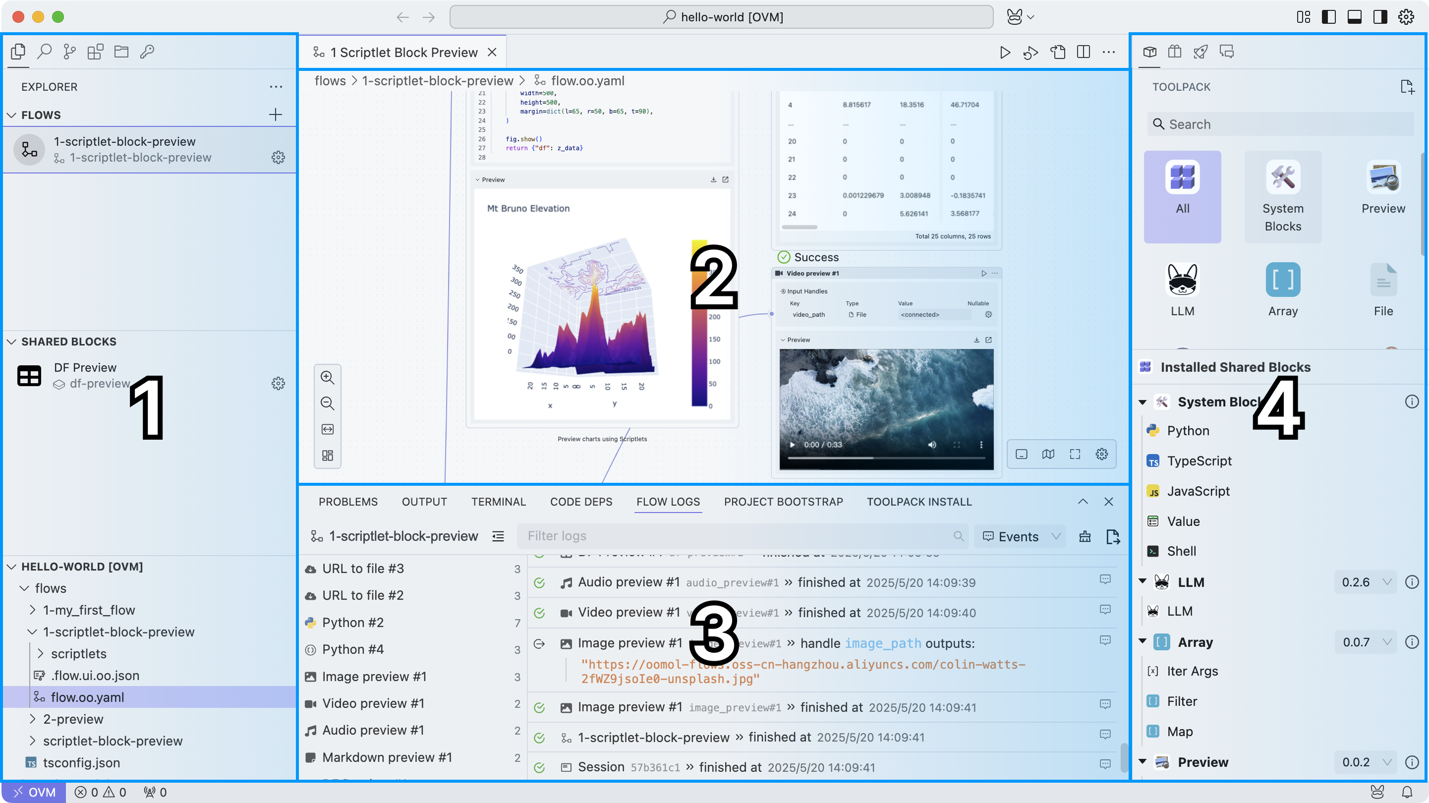 This area will display some log information from OOMOL Studio itself and output logs from plugins. Generally, you do not need to pay attention to this area.