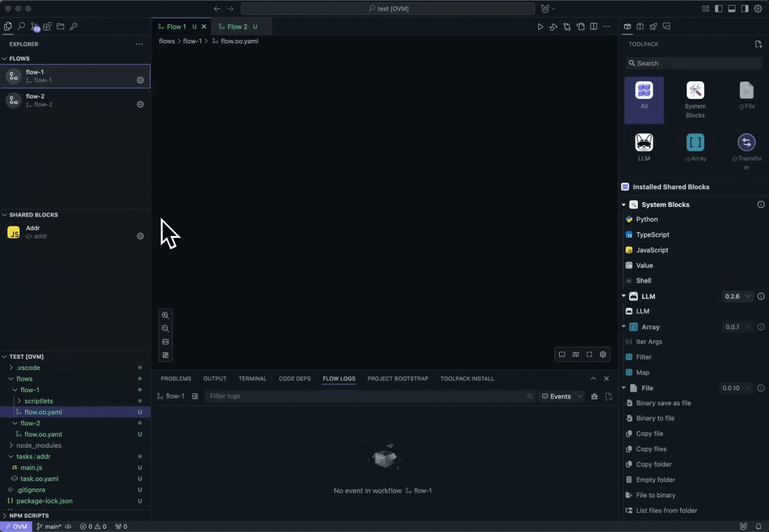You can see that multiple blocks are combined together in the Flow, forming a complete Flow to calculate the length of the hypotenuse of a right triangle. Each task block can run and be tested independently. They can be reused in other Flows and can also be combined across different programming languages.